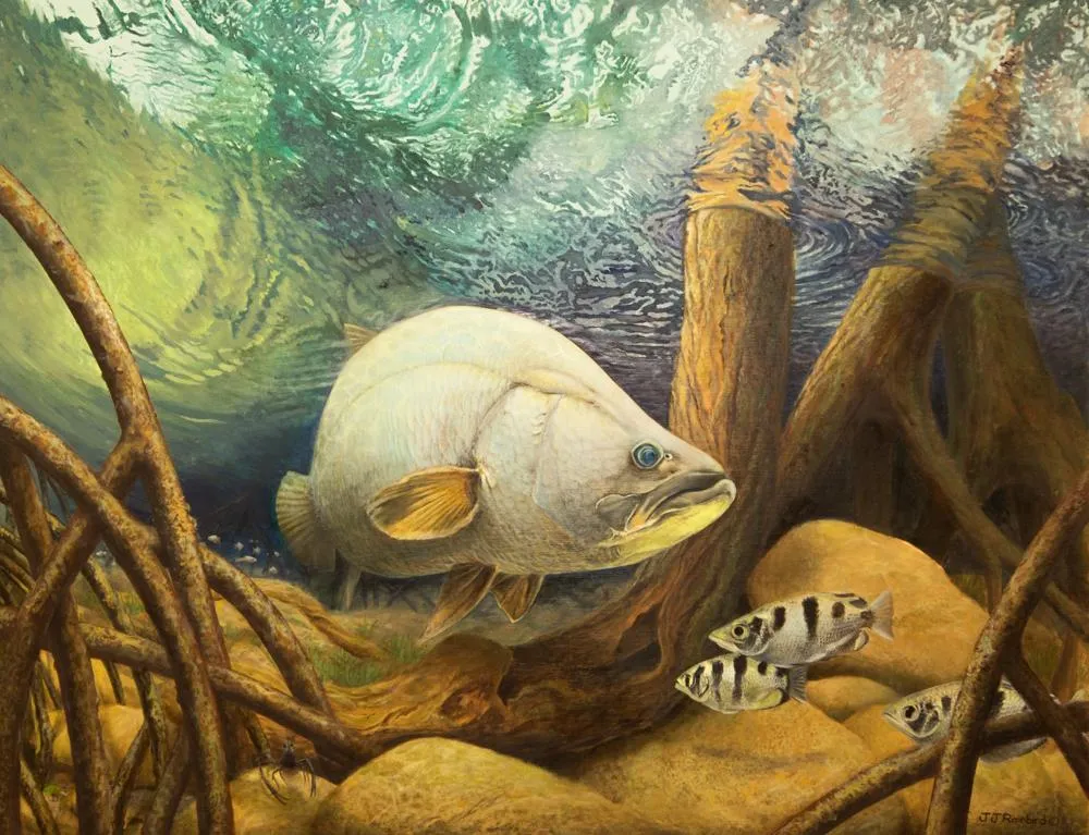 Queen of the Mangroves - Barramundi and archer fish - Oils. Original (framed) and prints (100 x 70 cm) $320