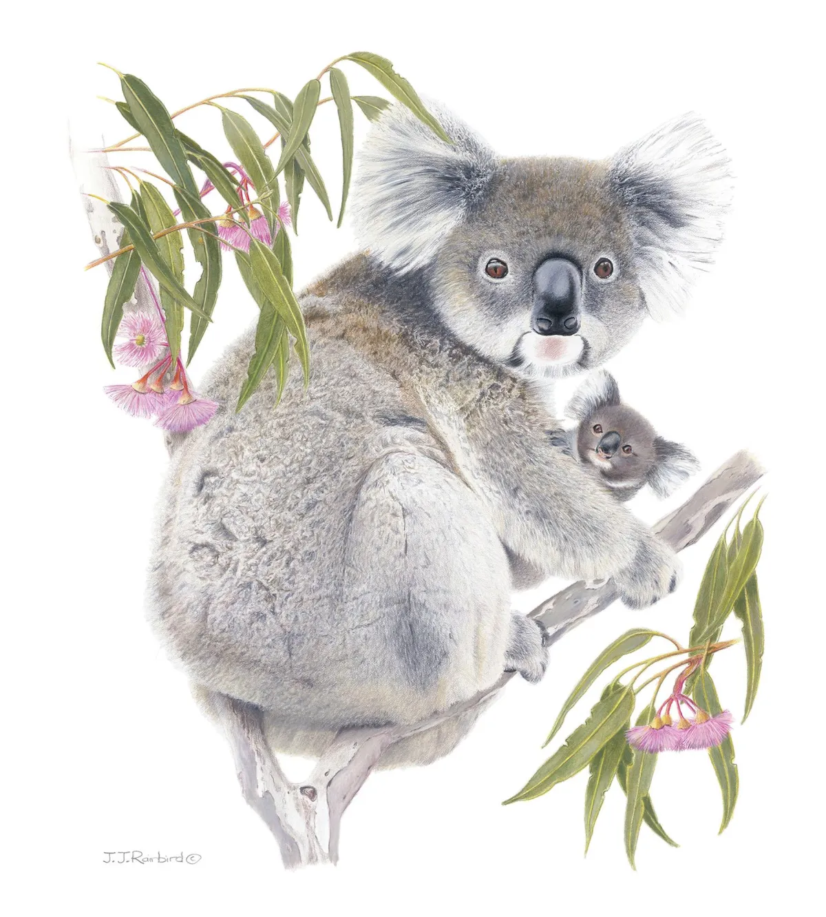 Tree Hugger - Koala and joey Original and prints. Coloured Pencil on paper